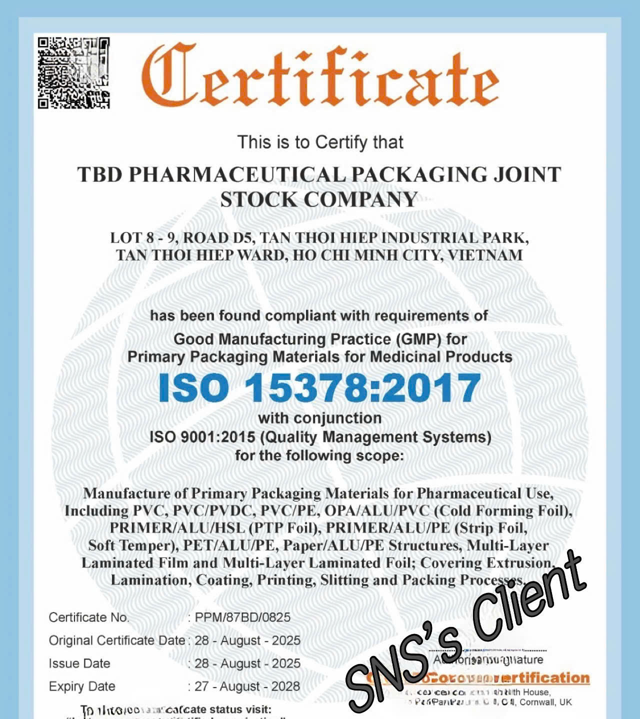 Mới đây nhất, SNS đã triển khai thành công dự án tư vấn- đào tạo- chứng nhận ISO 15378 cho Công ty Cổ phần Bao bì Dược TBD – đơn vị tiên phong trong sản xuất bao bì sơ cấp đạt chuẩn GMP và ISO 15378 tại Việt Nam.